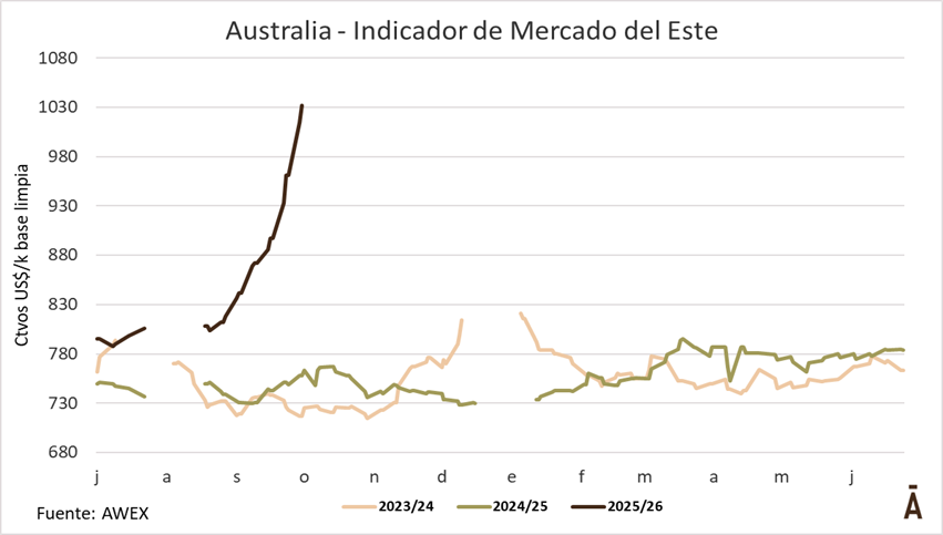 La semana cerró con una nueva y pronunciada suba en los precios de la lana en Australia. El Indicador de Mercados del Este (IME) cerró en 15,65 dólares australianos por kilogramo base limpia, en los dos días de ventas el indicador avanzó 112 centavos en la moneda australiana. El mercado acumula once semanas consecutivas de aumentos y una ganancia total de 358 centavos de dólares australianos en ese período, la mayor racha y el mayor incremento acumulado registrados en décadas.