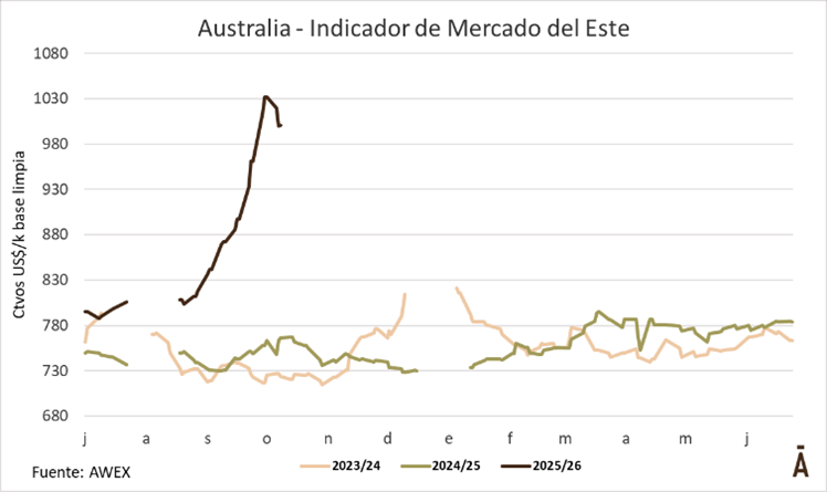 El mercado lanero australiano frenó su racha alcista y cerró la semana con una corrección sostenida que puso a prueba la capacidad de absorción de la demanda. Tras once semanas consecutivas de subas que sumaron 358 centavos australianos, el Indicador de Mercados del Este (IME) retrocedió 48 centavos hasta A$ 15,17 por kilogramo base limpia, mientras en dólares estadounidenses el indicador terminó en US$ 10,01, con una pérdida acumulada de 31 centavos desde el 1 de octubre. La caída semanal interrumpe una tendencia que había colocado al IME aproximadamente un 33% por encima del nivel del año anterior.