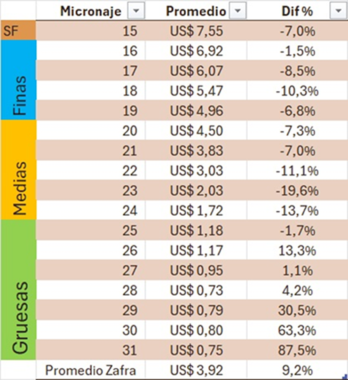 De acuerdo con las categorías de finura adoptadas por el Australian Wool Exchange (AWEX), las lanas por debajo de las 16,5 micras son clasificadas como superfinas; entre 16,5 y 19 micras como finas; entre 19 y 24 micras como medias; y entre 25 y 32 micras como gruesas. En función de esta clasificación, las lanas superfinas representaron 2,3% del volumen total de lana reportado en esta zafra, con un valor promedio que bajó 11% respecto a la zafra anterior a US$ 7,23 por kilo.