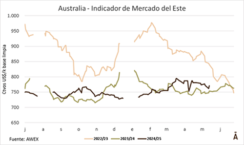 Luego de dos semanas de alta variabilidad en las monedas, generando subas y bajas importantes en ambas monedas, el mercado lanero australiano entró en el receso de Pascuas, retomando su actividad la próxima semana. El pasado miércoles 23, el Indicador de Mercados del Este (IME) cerró en AU$ 12,32 por kilogramo base limpia, con una caída semanal del 2,4%. A pesar de la caída en los valores en la semana anterior, en el acumulado de la presente zafra el indicador registrado una suba del 7,9%.