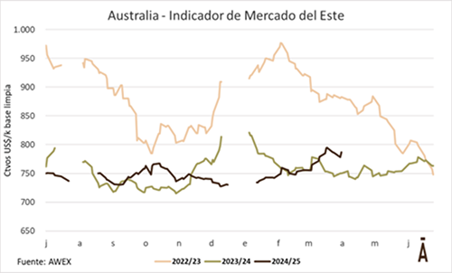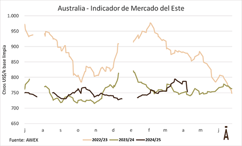 Las ventas cerradas el miércoles 16 de abril de 2025 (Semana 42) sumaron una nueva semana de volatilidad en el mercado lanero australiano, marcada por la fuerte fluctuación de las monedas. La semana anterior el debilitamiento del dólar australiano frente a su par estadounidense había determinado fuertes subas en la moneda local y caídas en dólares norteamericanos; en contrapartida, esta semana se fortaleció el aussie y se invirtió el comportamiento del Indicador de Mercados del Este, dependiendo de la moneda a analizar.