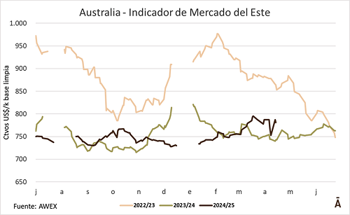 El mercado lanero australiano retomó la senda alcista, tras las bajas de la semana pasada, cerrando con subas tanto en la moneda australiana como en el norteamericana. El punto positivo fue que el impulso en los valores estuvo respaldado por una demanda china muy fuerte y con competencia tanto de India como de Europa. En contrapartida el punto negativo fue la fuerte fluctuación cambiaria en un mercado financiero con muchas incertidumbres ante los anuncios de Donal Trump, que en el miércoles concretó sus anuncios de mayores aranceles a nivel mundial.