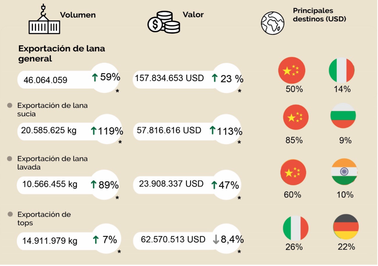 Durante 2024, la facturación de las exportaciones de lana creció 23% respecto al año anterior, superando los US$ 157 millones. Este incremento se vio impulsado por mayores ingresos por lana sucia, lavada y peinada, con China como el principal destino de las ventas, representando casi la mitad del valor total exportado, mientras que otros mercados como Italia y Alemania se enfrentan a descensos.