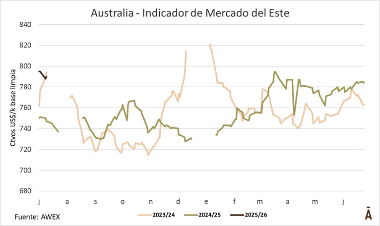 La tercera semana de ventas de la zafra lanera 2025/26 en Australia ha concluido con una tendencia positiva, a pesar de algunas fluctuaciones diarias, el mercado mantiene una importante demanda en todos los micronajes. En este escenario el Indicador de Mercados del Este (IME) cerró la semana en US$ 7,97, registrando una suba de siete centavos en la semana, mientras que en la moneda local se posicionó en A$ 12,21, subiendo nueve centavos.