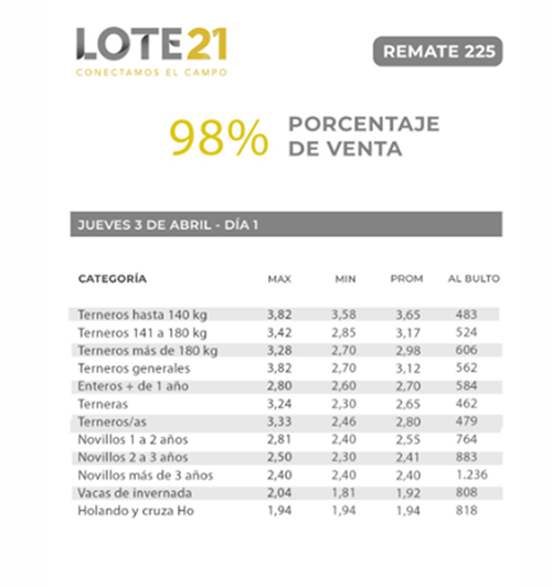 Los terneros hicieron un promedio de US$ 3,12 por kg en pie (US$ 562 al bulto). A continuación, el promedio del resto de las categorías de la primera jornada. Este viernes continúa la actividad con la escalera de vientres.