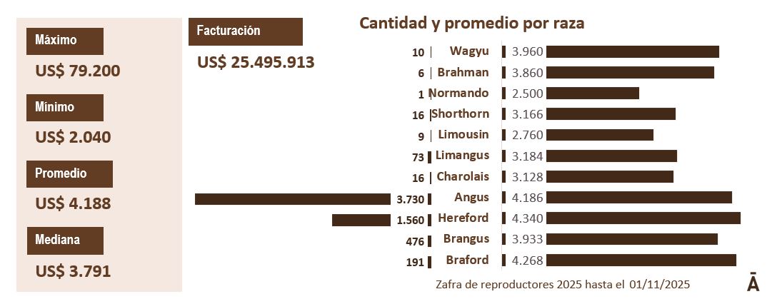 Del total de las ventas, el 58,9% de los toros cotizaron por debajo de ese valor medio. En tanto que la mediana se posicionó en US$ 3.840 y tuvo un aumento 23% entre zafras, mientras que el valor más repetido (moda) en la zafra fue US$ 3.600 para 560 toros.