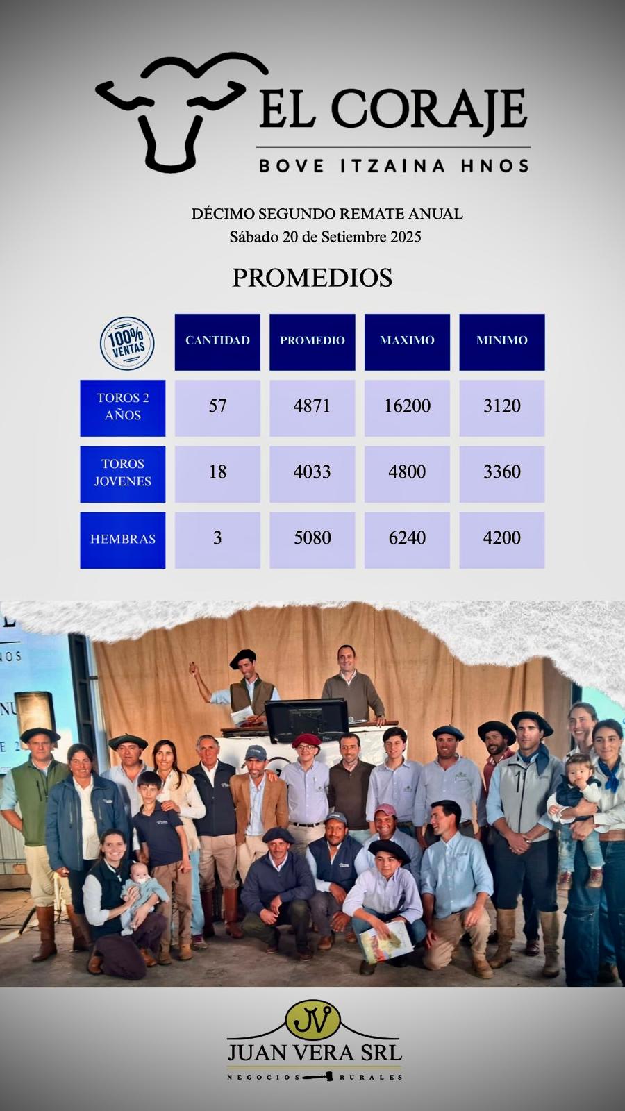 La venta del Brangus de la cabaña El Coraje, de la familia Bove Itzaina, fue total este sábado, tanto en la oferta de los toros como en los vientres con el martillo de Juan Vera. Como es tradicional, las ventas iniciaron con donaciones de embriones, semen y cuadros, realizados por la cabaña, con el fin de recaudar recursos para instituciones de la zona.