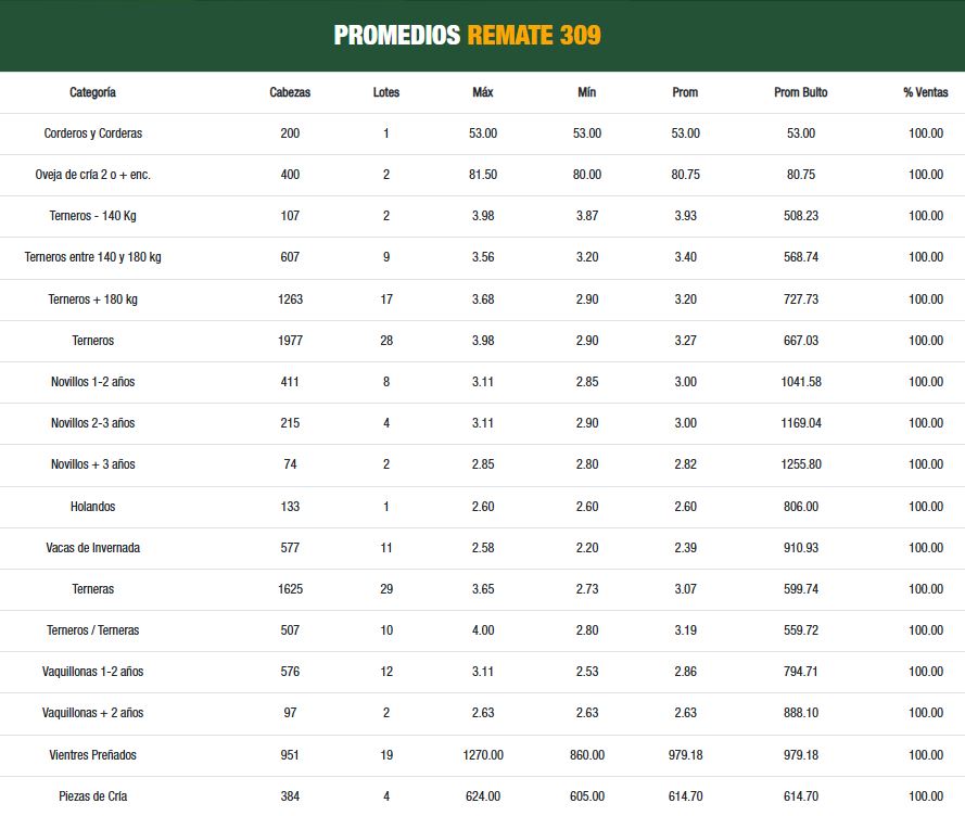 Lo mismo pasó con la categoría de novillos de 1-2 años (US$ 3,00), para la vaca de invernada (US$ 2,39), la vaquillona de 1-2 años (US$ 2,86), mientras que las de 2-3 años hicieron US$ 2,63.