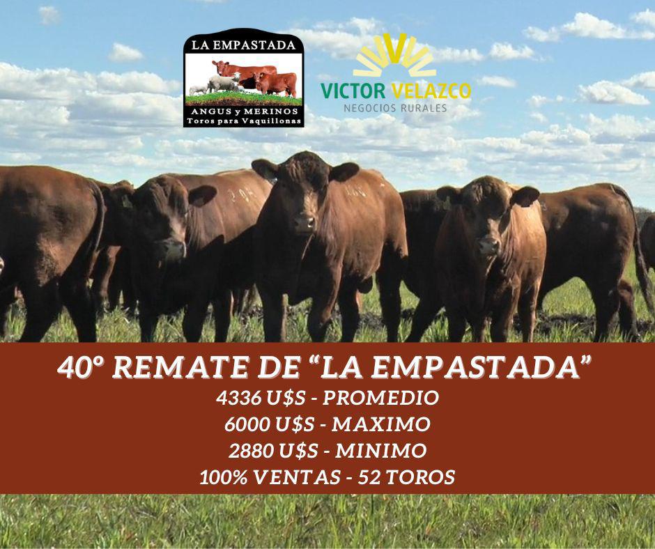 La Empastada realizó este viernes 26 de setiembre su 40° remate en el establecimiento, donde reunió a clientes de larga data y nuevos compradores para celebrar la trayectoria de la cabaña. Se colocaron los 52 toros Red Angus de 2 años ofertados, en un remate ágil que promedió US$ 4.336, con un mínimo de US$ 2.880 y un máximo de US$ 6.000.