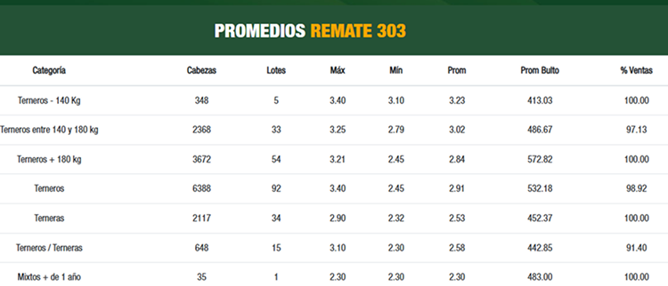 El consorcio Plaza Rural cerró este miércoles 14 su primer día de actividad del remate 304 con Plaza Angus con un porcentaje de venta del 96,5% y una comercialización de 9.214 terneros/as. Los 5.207 terneros hicieron un promedio general de US$ 2,82 por kg en pie (US$ 545 al bulto). Si bien el precio por kg fue inferior al remate anterior (US$ 2,91), al bulto fue superior (US$ 532).