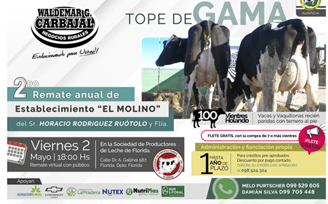La zafra de ganado lechero de otoño tendrá este viernes 2 de mayo otro mojón alto con la genética lechera del establecimiento El Molino de Horacio Rodríguez y Flia. En su segundo remate anual, saldrán a la pista 100 vacas y vaquillonas recién paridas, con 1 año de plazo con administración propia y flete gratis para la compra de 7 o más vientres. La actividad será virtual y con público en la sede de la Sociedad de Productores de Leche de Florida (SPLF).