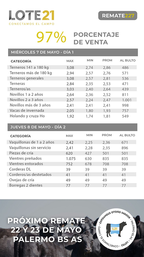 Lote 21 cerró este jueves su remate 227, el primero de mayo, con un 97% de ventas. Los terneros hicieron un promedio general de US$ 2,81 por kg en pie (US$ 536 al bulto), mientras que las terneras se negociaron a US$ 2,53 (US$ 471 al bulto), los novillos de 1 a 2 años US$ 2,52, la vaca de invernada US$ 1,93, y las piezas de cría US$ 501.