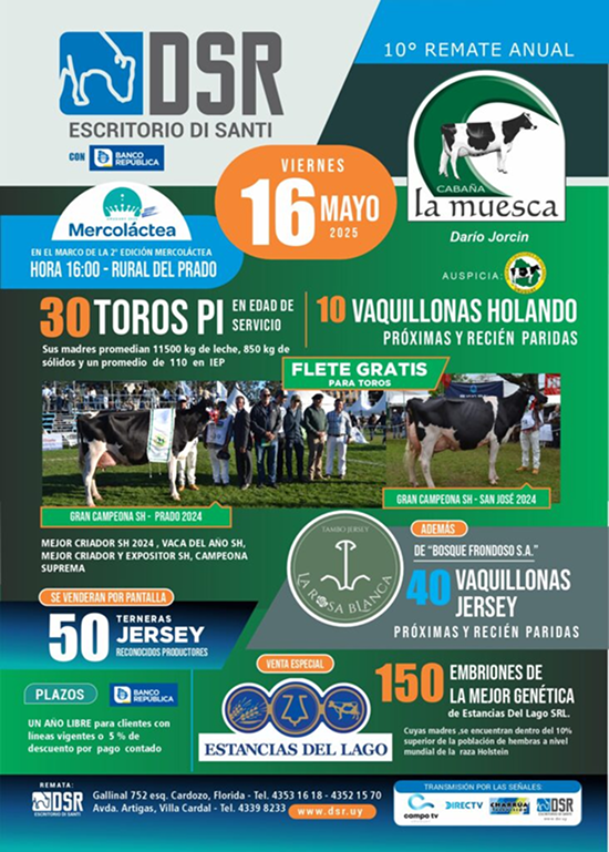 En el marco de una nueva edición de la Mercoláctea (que da inicio este jueves), el escritorio Di Santi (DSR) tendrá un destacado remate de genética lechera este viernes 16 de mayo. Desde la hora 16, saldrán a la venta 30 toros PI y vaquillonas Holando próximas y recién paridas de La Muesca de Darío Jorcin.