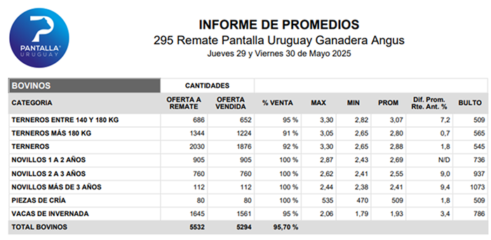 El consorcio Pantalla Uruguay tuvo este jueves su primer día de actividad de su remate 295 con un 96% de ventas (5.294 cabezas). Allí los 2.030 terneros hicieron un promedio general de US$ 2,88 (+1,8%) o US$ 545 al bulto; los novillos de 1 a 2 años US$ 2,69, y los de 2 a 3 años US$ 2,55 (+9%).