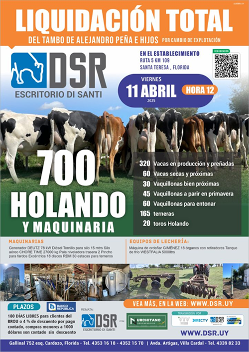 La zafra de ganado lechero de otoño tendrá otro mojón relevante este viernes 11 de abril en Florida con la liquidación total del tambo de Alejandro Peña e Hijos por cambio de explotación.