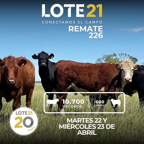 Desde este martes 22 y miércoles 23 de abril, Lote 21 estará presente con su remate 226 desde la Escuela de Alta Gastronomía Punta del Este. El consorcio estará ofreciendo 10.700 vacunos y 600 lanares desde las 9 AM con sanidad Microsules y financiación Santander.