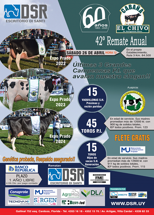 Este sábado 26 de abril será el turno para otro plato fuerte de la zafra de ganado lechero con el 42º remate anual El Chivo de Antognazza Hnos, la cabaña que tuvo las tres últimas grandes campeonas PI en la Expo Prado. Además, de los 45 toros PI en edad de servicios con madres que promedian 12.000 kl y 900 kg de sólidos totales e IEP positivo (promedio 123), también saldrán a la venta 15 vaquillonas SH próximas y recién paridas, y 15 toros hijos de vacas SH Generación.